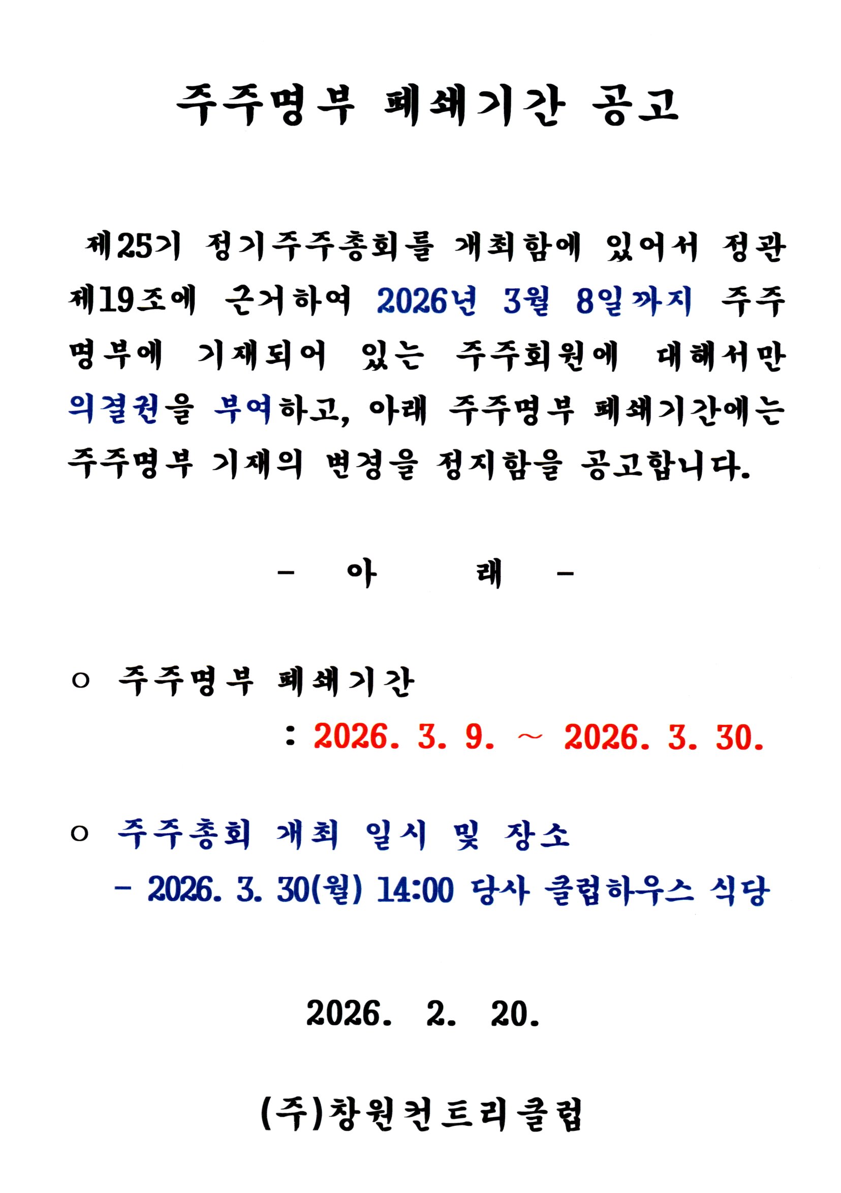 주주명부 폐쇄기간 공고