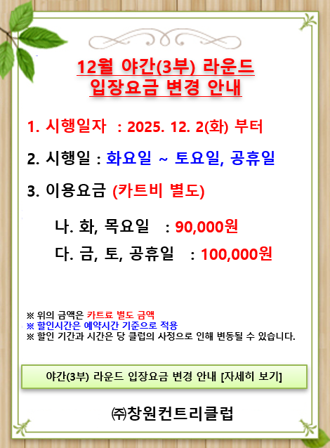 12월 야간(3부) 라운드 입장요금 변경