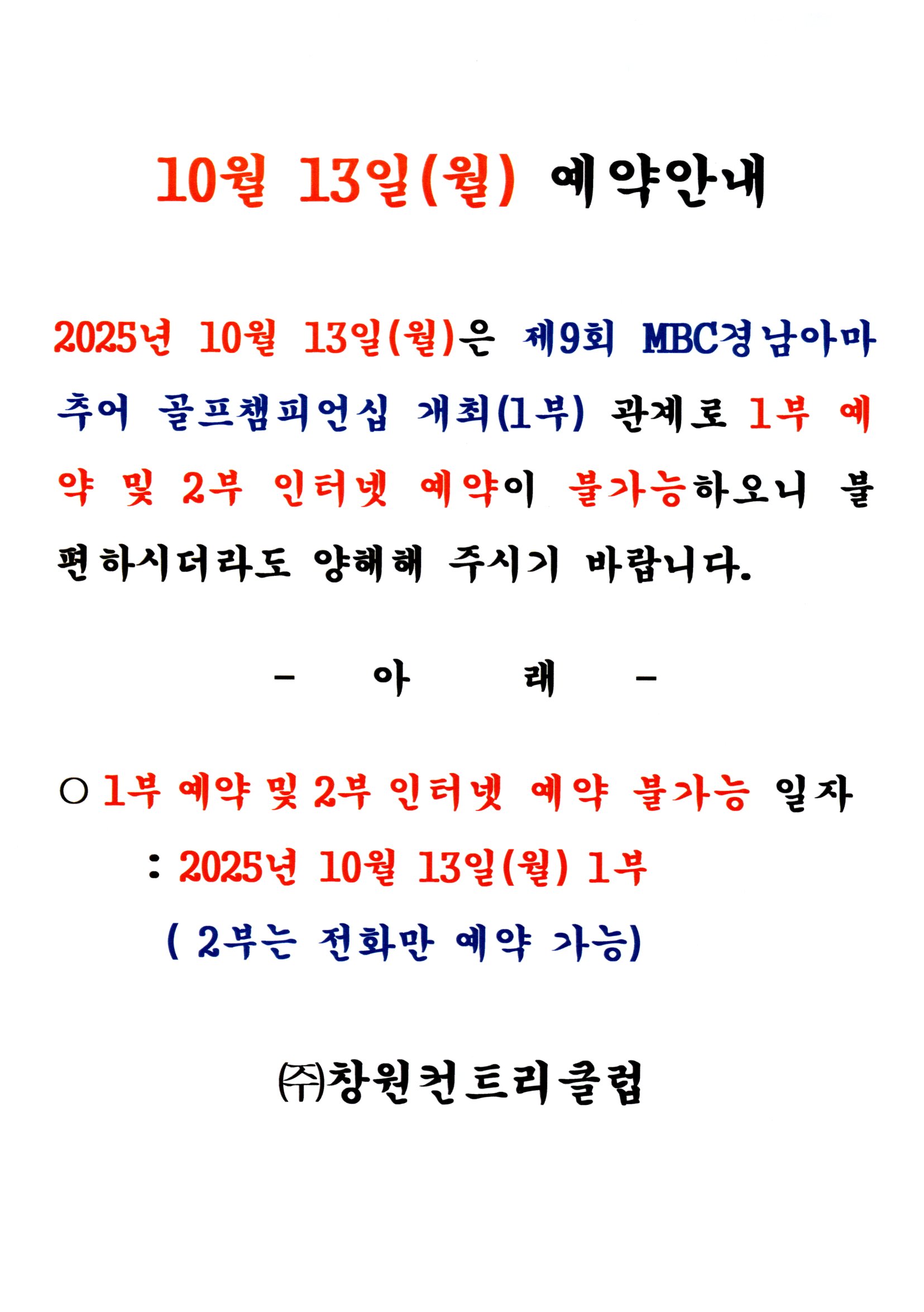 (제 9회 MBC경남아마추어 골프챔피언십 개최 관계로 전화 및 인터넷 예약 불가 안내)